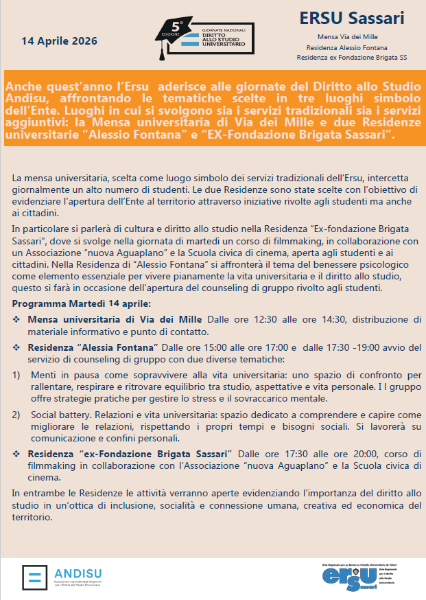 La prossima settimana si svolgeranno in tutta Italia e con un evento principale a Udine, le Giornate Nazionali per il Diritto allo Studio, promosse dall’ Andisu, l'Associazione nazionale degli organismi Dsu, e che anche l' Ersu di Sassari celebrerà con diverse iniziative il giorno martedi 14 aprile, sono un’occasione preziosa per riflettere su quanto questo diritto sia fondamentale per la società e su quanto lavoro resti da fare per renderlo pienamente effettivo.